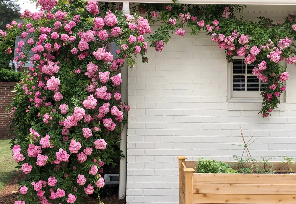 The Pink Peggy Martin rose trains beautifully along a fence, its vigorous canes weaving through pickets and trellis to create a living curtain of ruffled, mid-pink blooms that last from spring into fall; hardy and disease-resistant, this rose tolerates Houston heat and humidity better than many old-fashioned varieties, and its repeat-flowering habit combined with glossy green foliage makes it an ideal choice for turning a plain fence into a fragrant, cottage-style focal point while providing quick coverage and seasonal interest.